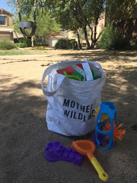 | One of my favorite mom hacks is to always have a good tote bag in my car filled up with sand toys to play with. When you have 30 minutes to kill in between kiddo appts you can make a quick park pit stop easily. My tote is from Brittany Garner Design and I LOVE it! |